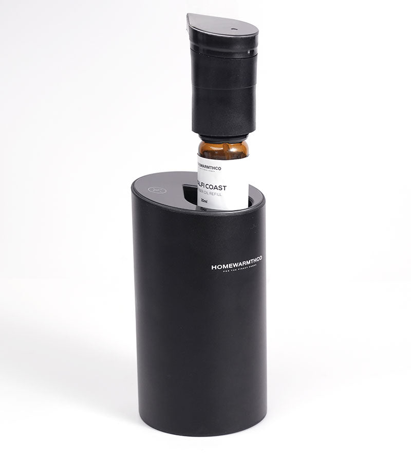 Remove the top, unscrew the fragrance bottle, fill it with scent, and reattach the top. Push the 'Push Out Button' at the bottom and pull out the upper lid. Insert the liquid tubing, remove the cap and dropper lid from the bottle, screw it in, and place it back into the slot. Hold the power button for 1.5 seconds to turn on/off and press to adjust intensity.
